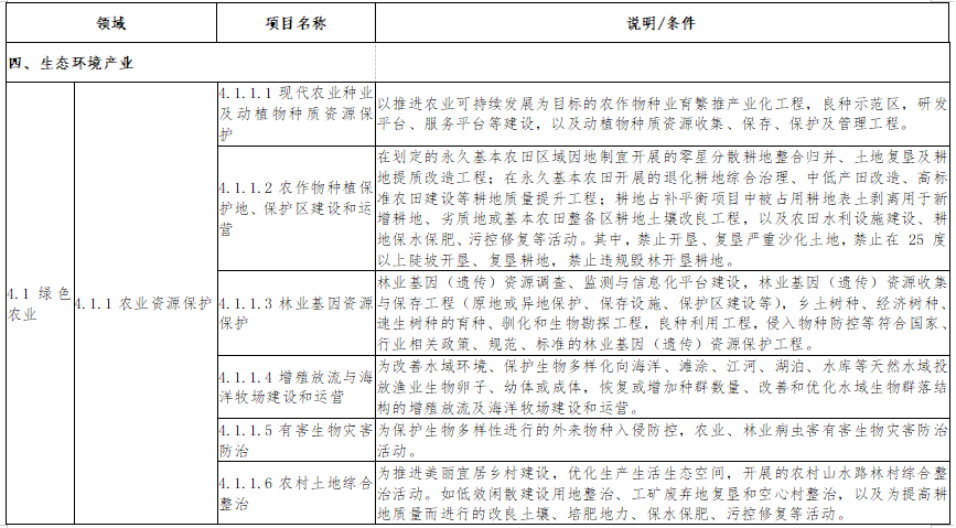 其中:一级分类包括节能环保产业、清洁生产产业、清洁能源产业、生态环境产业、基础设施绿色升级、绿色服务六大类。二级和三级分类延用《绿色债券支持项目目录(2015年版)》的基本思路,增加了《绿色产业指导目录(2019年版)》中有关绿色农业、可持续建筑、水资源节约和非常规水资源利用的分类层级,并扩展了农业和生态保护等领域的支持项目范围。四级分类与《绿色产业指导目录(2019年版)》的三级分类名称保持一致,基本涵盖《绿色产业指导目录(2019年版)》中的相关绿色产业和项目。