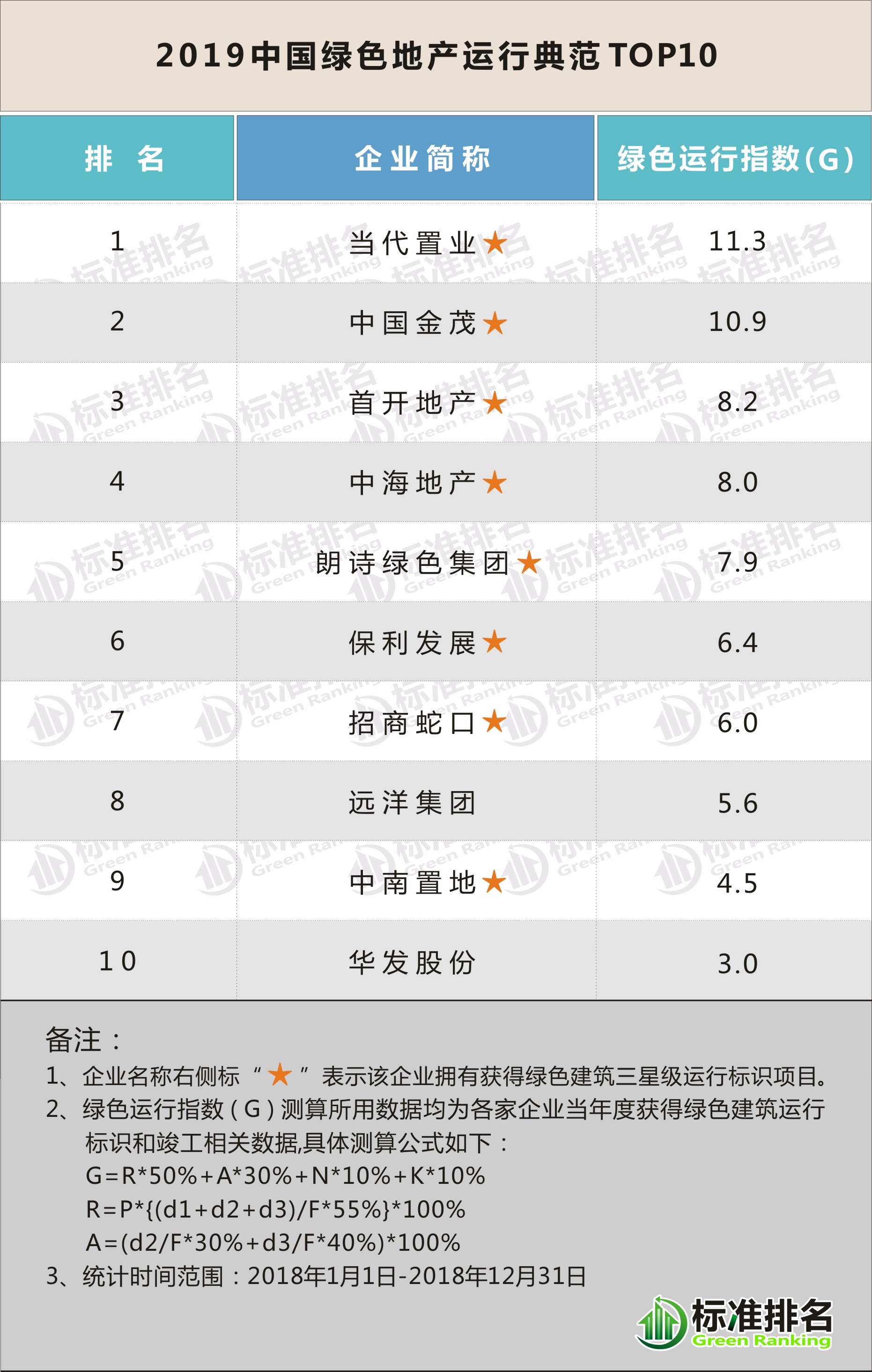 标准排名2019中国绿色地产指数TOP30显示,中国金茂、万科集团、中海地产、碧桂园、中国恒大、首开地产、葛洲坝地产、当代置业、绿城中国、龙湖集团、朗诗绿色集团、宝龙地产、招商蛇口等企业成为2019中国绿色地产指数TOP30的前十名。