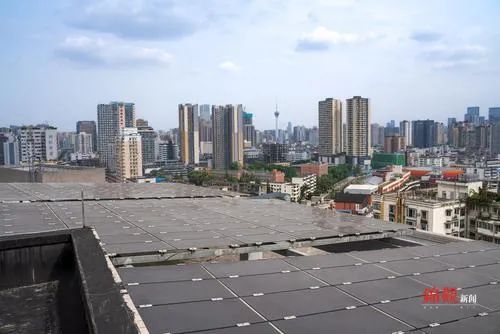 屋顶上,一大片排列整齐的太阳能光伏板像平整的镜子,在“吸吮”着阳光。