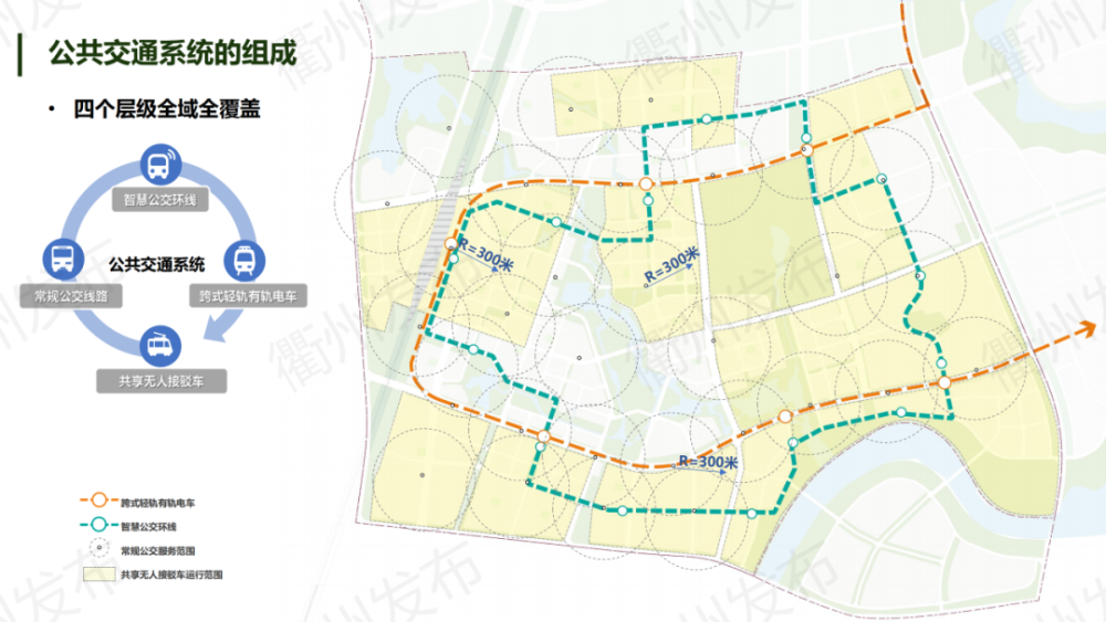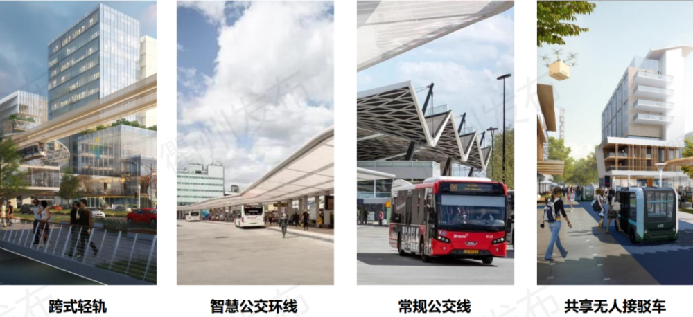 高铁新城公共交通系统由共享无人接驳车、常规公交线路、智慧公交环线、跨式轻轨有轨电车组成,四个层级全域全覆盖。