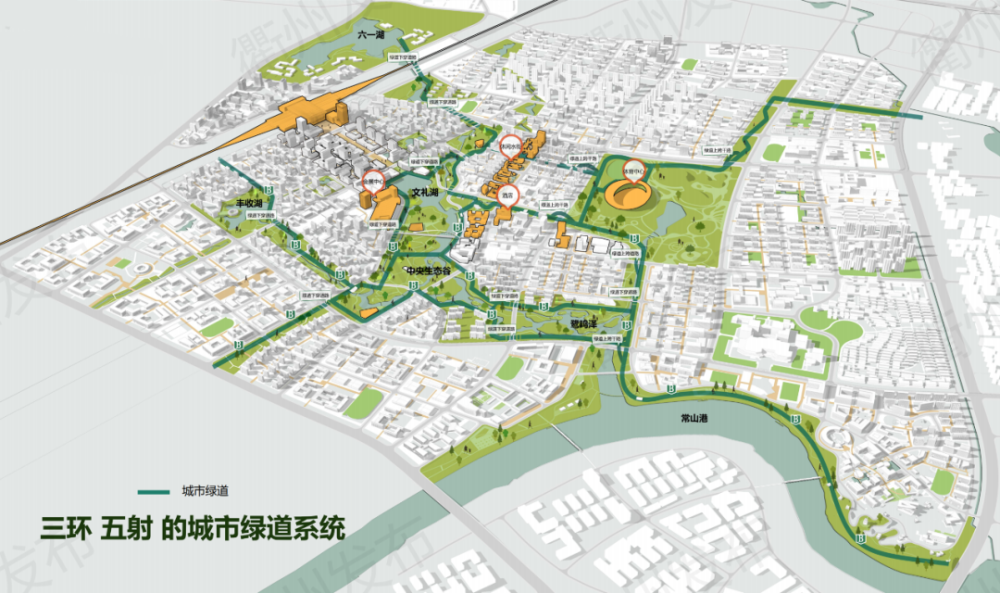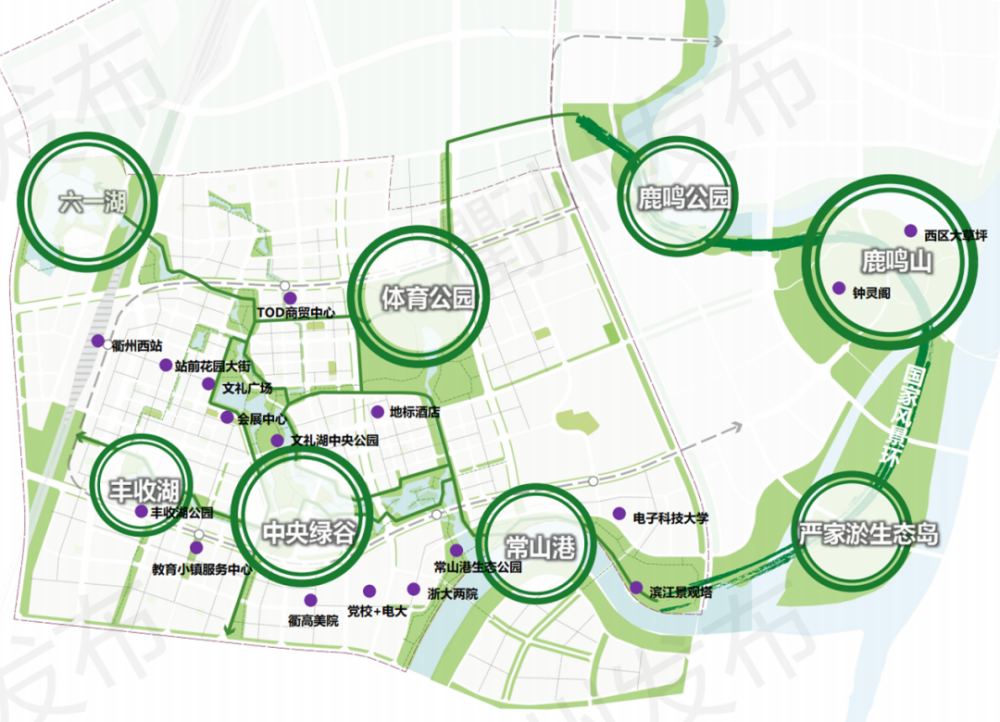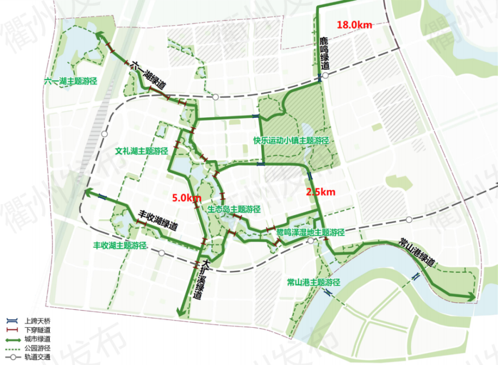 高铁新城的绿道系统最终纳入到整个智慧新城的衢州国家风景环之中,最终接入衢州18km风景环。