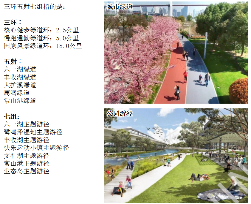 绿道系统由城市绿道+公园游径两个层级共同组成绿道系统,总体形成三环五射七组的慢性系统结构。