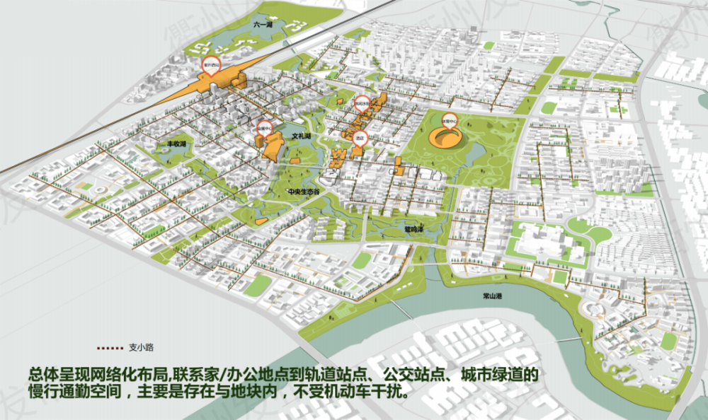 支小路是绿色出行方式最基本的纽带,它联系了家/办公地点、轨道站点、重要公交站点、城市绿道系统、无人接驳车驿站等绿色出行方式。支小路的布局,整体提升了绿色出行的品质。