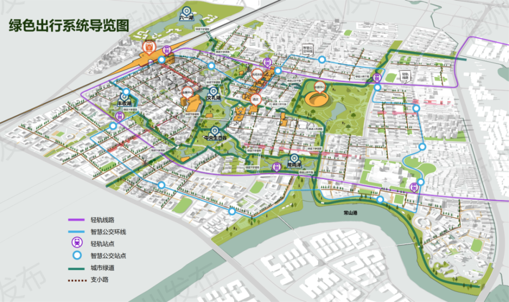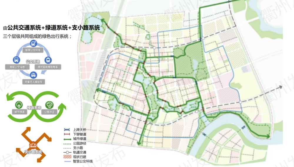 根据规划,高铁新城绿色出行系统是由公共交通系统+绿道系统+支小路系统三个层级共同组成的绿色出行系统。