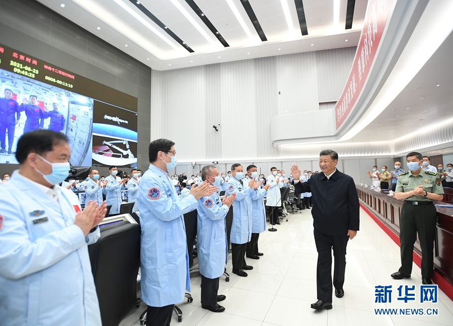6月23日,中共中央总书记、国家主席、中央军委主席习近平来到北京航天飞行控制中心,同正在天和核心舱执行任务的神舟十二号航天员聂海胜、刘伯明、汤洪波亲切通话。这是通话结束后,习近平向他们挥手致意,向现场参试人员表示慰问。新华社记者 燕雁 摄