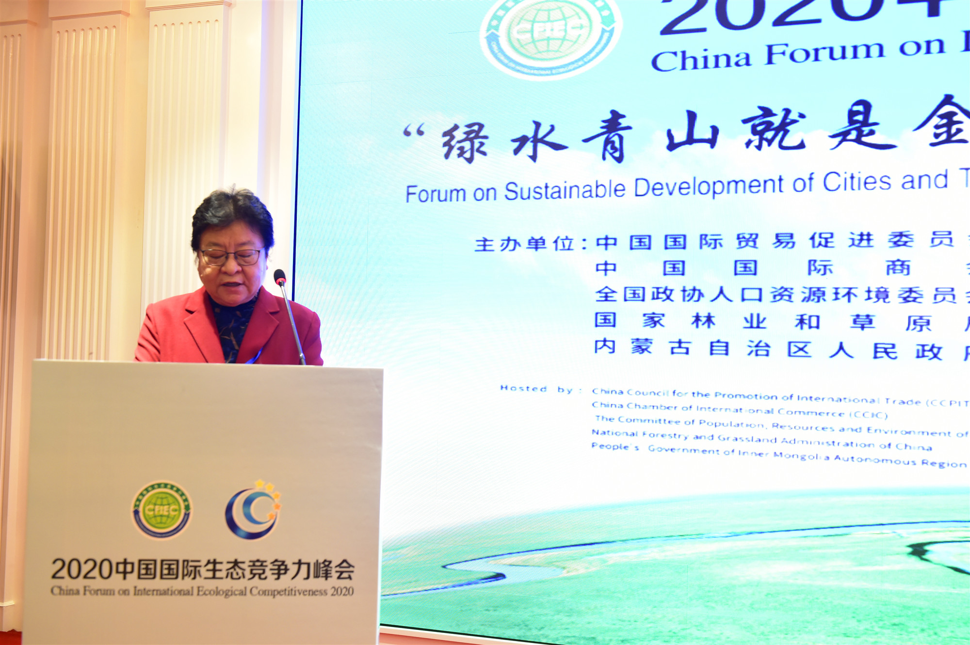 据了解,本次峰会由中国国际商会秘书长于建龙主持, 随后由内蒙古自治区政府副主席黄志强,全国政协人口资源环境委员会副主任任亚平,中国国际贸易促进委员会、中国国际商会副会长张少刚,全国绿化委员会办公室专职副主任胡章翠,冰岛等国大使先后致辞,并举行2020最具生态竞争力城市颁奖仪式。本次峰会齐聚数百位专家学者政企代表,围绕生态治理、能源环境、农牧产业、文化旅游、智慧经济等领域交流发展经验,共同探讨绿金产业合作模式。