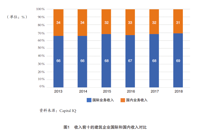 虽然全球经济受到新冠疫情的打击,但建筑业的全球化早已成为一个不可逆转的趋势。据Capital lQ数据库统计显示,全球利润前十的大型建筑企业,国际业务收入占比近年来不断提高,大约占全部收入的70%(见图1)。