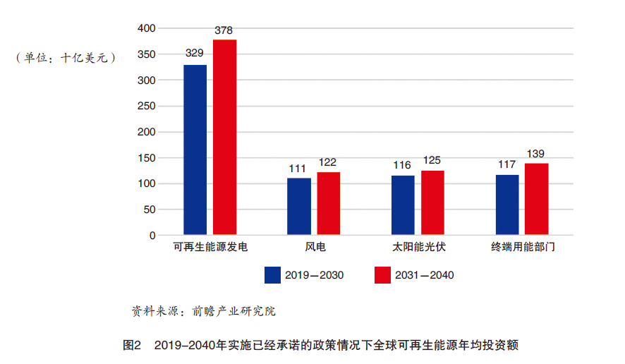 图2中显示2019-2040年全球各个政府和机构对可再生能源的年均投资额将达到1.4万亿美元。疫情的出现会让各国决策人更加认识到改善环境和生态的必要性、紧迫性,进而加快新项目实施的进度。