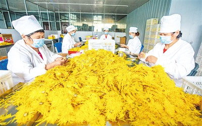 近年来,山西新桐农业开发有限公司发展药茶产业,目前种植面积达300多亩,产品畅销全国,药茶产业成为当地农民增收的特色产业。图为8月22日,山西闻喜县桐城镇上白土村村民在该公司车间包装菊花茶。
