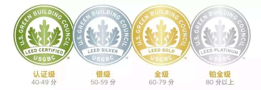 LEED评估体系从可持续建筑场址、水资源利用、建筑节能与大气、资源与材料、室内空气质量五个方面,对建筑进行综合考察、评判,并根据综合得分结果,将通过评估的建筑分为铂金、金、银和认证级别,其中铂金级最难获得,被誉为全球绿色建筑领域的“奥斯卡奖”。