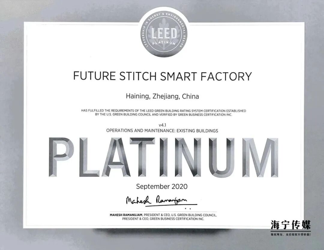 2020年9月,海宁针永体育智慧工厂项目获得了美国绿色建筑委员会(USGBC)颁发的 LEED 最新版本的既有建筑运营及维护(Building operations and maintenance)铂金级认证,是世界第九家、中国第一家荣获(LEED-OM)铂金级认证的工厂,意义非凡。