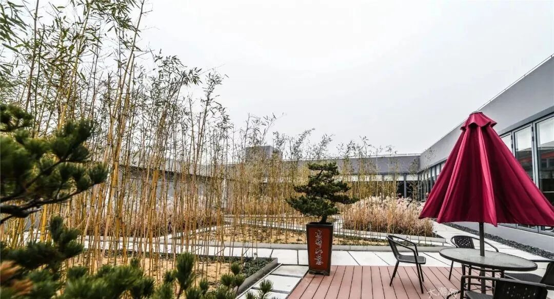 4楼的周围是办公区域、员工食堂、健身房,中间一半是屋顶篮球场,旁边还有一个小型的看台。而另一半则是种着芦苇草的屋顶花园,天晴的时候还可以喝个下午茶。