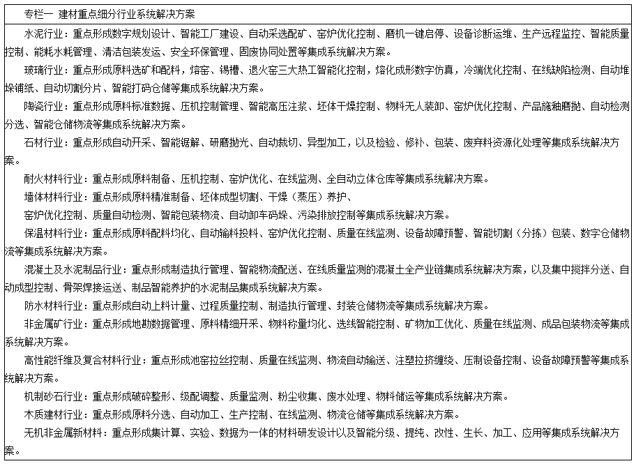 6.形成一批系统解决方案。针对建材细分行业特点,以矿山开采、原料制备、破碎粉磨、窑炉控制、物流仓储、在线检测等关键环节为重点,提炼形成若干套具有智能感知、自动执行、深度学习、智能决策、密码防护等功能的智能化、数字化、集成化系统解决方案,促进水泥、玻璃、陶瓷等行业生产方式的自动化、智能化、无人化变革。