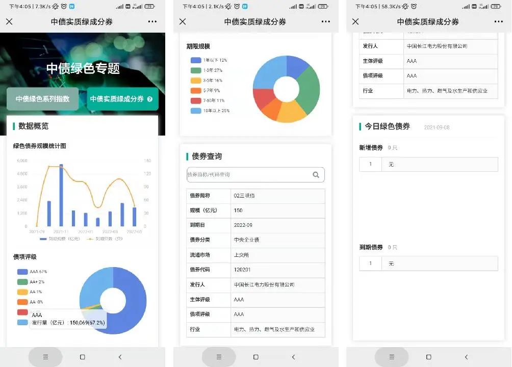 中债“实质绿”成分券模块包括三大服务功能:数据概览、债券查询、今日绿色债券。数据概览实现了中债实质绿成分券到期规模、期限规模、评级等多维度统计;通过债券查询功能,投资者可搜索关注债券的发行人及债项的基本信息;今日绿色债券则动态提供每日新增/到期绿债信息,可让投资者及时了解中债绿色指数成分券变动情况,关注新增绿债的投资机会。