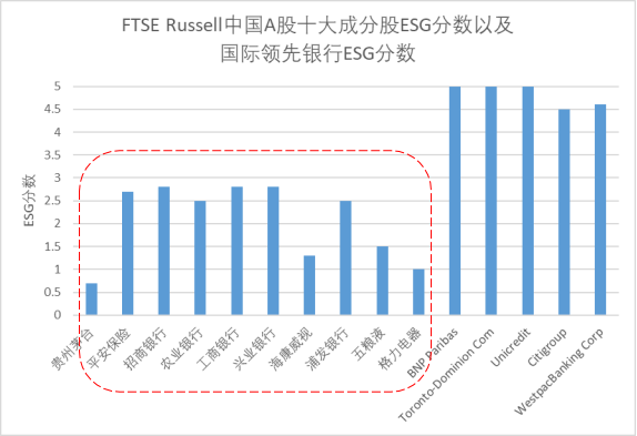 图1 富时中国A股前十大成分股ESG分数(2019年9月数据)