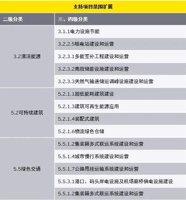 二级和三级分类延用《绿色债券支持项目目录(2015年版)》的基本思路,增加了《绿色产业指导目录(2019年版)》中有关可持续建筑、水资源节约和非常规水资源利用的分类层级,并扩展了农业和生态保护等领域的支持项目范围,同时增加了绿色装备制造类项目。四级分类与《绿色产业指导目录(2019年版)》的三级分类名称保持一致,基本涵盖《绿色产业指导目录(2019年版)》中的相关绿色产业和项目。