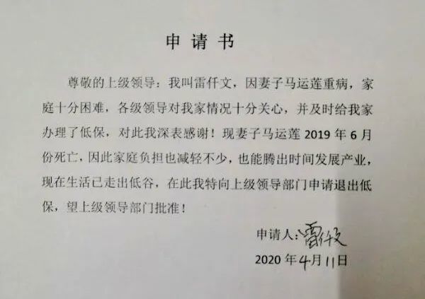 去年4月11日,雷仟文找到人行安陆市支行驻长安村工作队队长郑宗友,交上退出低保申请书。