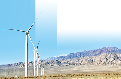 柴达木盆地上,巨大的风力发电机正在运转。 |