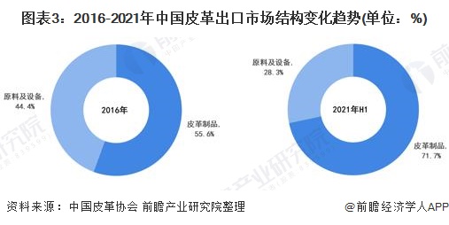 从皮革行业进口产品结构来看,近年来我国皮革制品进口规模持续快速增长,皮革制品进口占比从2016年的55.6%提高到2021年上半年的71.7%,2021年上半年的制品进口占比较2020年同期提升了5.0个百分点,显示出我国皮革产品进口结构由生产型向消费型转变的趋势日趋明显。