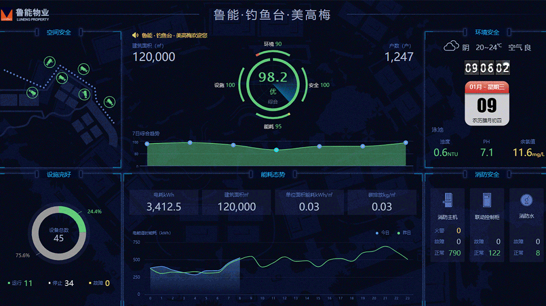 在物业运营管理过程中,智慧楼宇一体化平台的管理系统可以实时、准确、详细地掌握每个用能终端的能源消耗数据,协助建筑管理人员发现能耗黑洞,并且能够给出改进节能运行的建议,来提高设备能源利用效率和建筑节能运行管理水平,减少建筑运行周期的碳排放。根据能源中心针对一年内不同季节环境的试验运行数据分析,上海鲁能国际中心设计节能率提高30%,每年可节约标煤4107吨,减少二氧化碳排放10760吨。