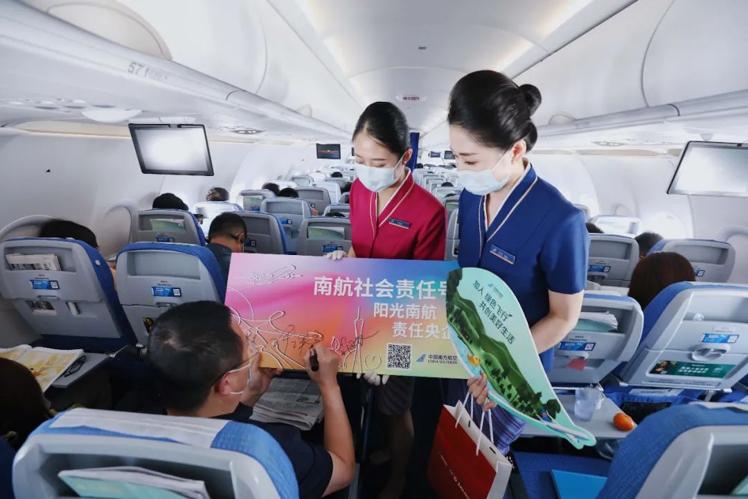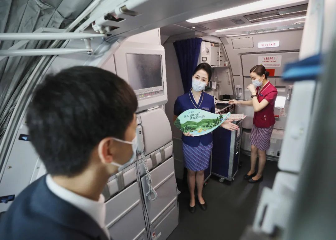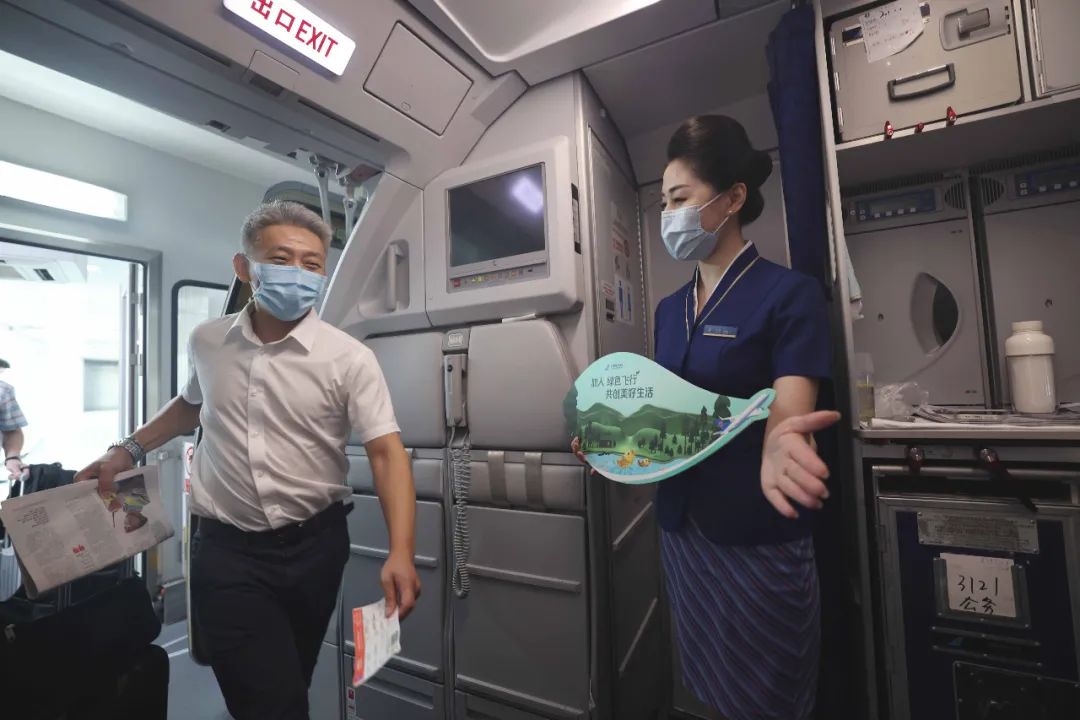 飞机平飞后,南航乘务长高扬向旅客介绍此次主题航班活动:“南航利用科技创新,在购票、出行、乘机和出行后四大环节,为旅客提供订票、支付、值机、安检、登机,以及电子发票等绿色低碳的全旅程体验。