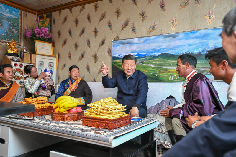 6月7日至9日,中共中央总书记、国家主席、中央军委主席习近平在青海考察。这是8日下午,习近平在海北藏族自治州刚察县沙柳河镇果洛藏贡麻村,走进藏族牧民索南才让家中了解生产生活情况。新华社记者 李学仁 摄