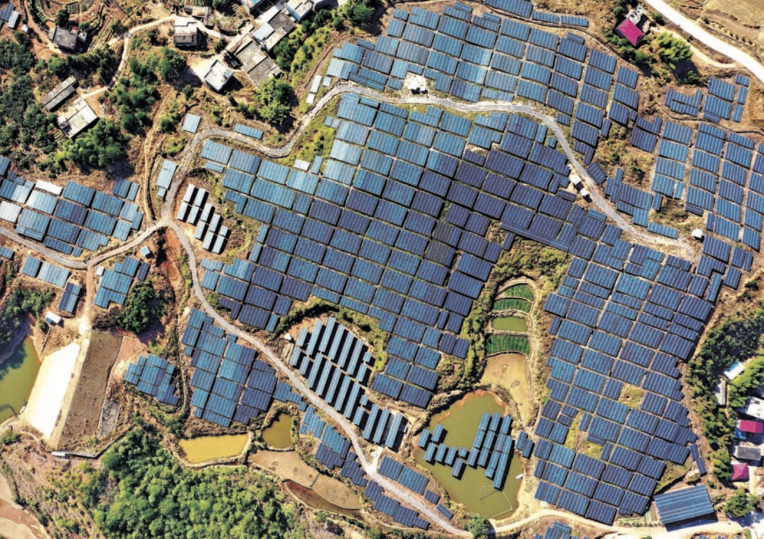 ▲2021年1月4日,江西省赣州市会昌县庄口镇黄沙村的贫瘠荒山上建起光伏扶贫电站,鳞次栉比的蓝色光伏聚能板为国家电网持续提供着绿色能源。(供图 视觉中国)