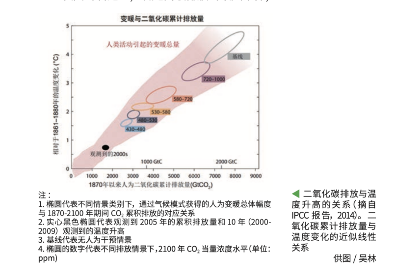 人类为什么要应对气候变化呢?当前科学共同体研明,温室气体排放会导致全球温度升高并触发气候灾难,比如干旱、飓风等,一些百年一遇的灾难可能会变成十年一遇,这是人类难以承受的。为了把温度控制在有限的升高范围之内,人类就要控制温室气体的排放量。那么二氧化碳的排放量和温度升高是一个什么样的关系呢?通过研究,科学家发现二氧化碳以及其他温室气体的累积排放与温度升高之间大致呈线性关系的。
