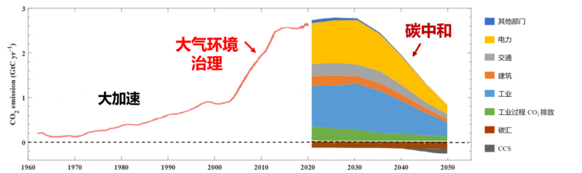 ▲碳排放加速增加、达峰与碳中和路径示意图。我国生态环境治理的重要工作将逐渐从大气环境治理过渡到碳中和(图源:清华大学气候变化与可持续发展研究院研究报告)