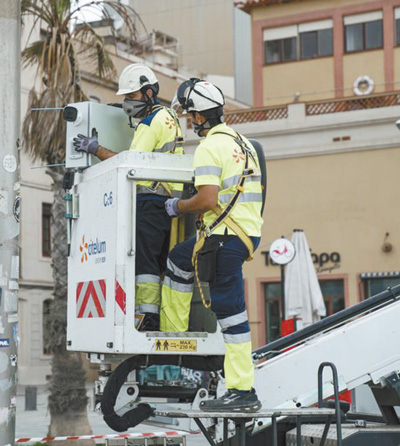 两名工人正在西班牙巴塞罗那街头安装无线智能传感器。 |