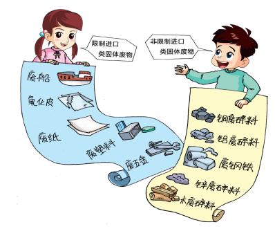截至2015年,列名限制进口类固体废物有废纸、废塑料、废五金、氧化皮、废船等十大类55种废物,其中糖蜜、云母废料、硅废碎料、未硫化橡胶废碎料及下脚料、皮革边角料等4类7种废物由于目前没有环境保护控制标准,所以尚不能办理进口许可手续。列名非限制进口类固体废物有铜废碎料、铝废碎料、废钢铁、锌废碎料和木废碎料等两大类18种废物。