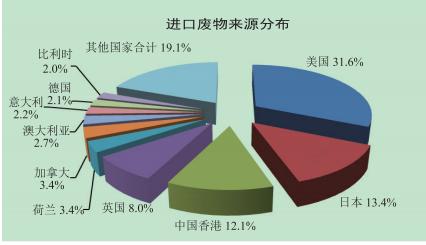 依据近十年的统计数据,我国进口的废物主要来自美国、日本、英国、欧盟、中国香港等发达国家和地区。其中,中国香港作为贸易自由港的特殊地位,主要以转口贸易为主。以2014年为例,美国、英国、日本和加拿大是废纸进口的主要来源国,合计占废纸进口总量的74.4%;废塑料进口主要来自香港、日本、美国和德国,合计占废塑料进口总量的65.5%;废五金进口主要来自日本、香港、美国和马来西亚,合计占废五金进口总量的80.2%;氧化皮,俗称氧化铁皮,进口主要来自印度、泰国、印度尼西亚、巴基斯坦、土耳其和埃及,合计占氧化皮进口总量的59.6%;铝废碎料进口主要来自美国、香港、马来西亚、澳大利亚和英国,合计占铝废碎料进口总量的85. 8%;铜废碎料进口主要来自美国、英国、墨西哥、德国和香港,合计占铜废碎料进口总量的56.4%;废船进口主要来自印度尼西亚、巴拿马、澳大利亚、阿曼、韩国和新加坡,合计占废船进口总量的55.9%;废钢铁进口主要来自美国、日本、香港和澳大利亚,合计占废钢铁进口总量的89.9%。