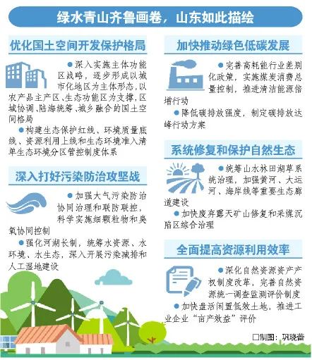 良好生态环境是经济社会持续健康发展的重要基础。《中共山东省委关于制定山东省国民经济和社会发展第十四个五年规划和二〇三五年远景目标的建议》(以下简称《建议》)聚焦“推动绿色发展,绘就绿水青山齐鲁画卷”,在优化国土空间开发保护格局、加快推动绿色低碳发展、深入打好污染防治攻坚战、系统修复和保护自然生态、全面提高资源利用效率等五个方面提出了一系列举措,推动经济社会发展全面绿色转型。
